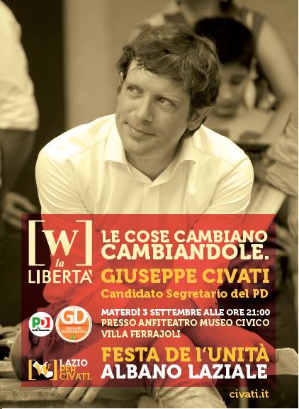03/09/2013 comment 0 Stasera, #Civati, ad Albano Laziale. #tantipiccolipescirossi Nient’altro da dire: non si può mancare. P.S. Se l’onestà intellettuale di taluni si sveglia, è anche previsto uno streaming su Europa Quotidiano. Condividi Fai clic per condividere su X (Si apre in una nuova finestra) X Fai clic per condividere su Facebook (Si apre in una nuova finestra) Facebook Fai clic qui per condividere su LinkedIn (Si apre in una nuova finestra) LinkedIn Fai clic qui per condividere su Tumblr (Si apre in una nuova finestra) Tumblr Mi piace Caricamento... Correlati