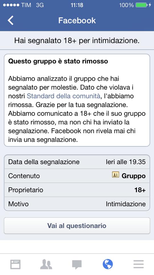 Il giorno seguente un altro contatto mi invia questo screenshot sulla sinistra. Il gruppo 18+, evidentemente segnalato da migliaia di utenti Fb (in questo caso “per intimidazione”), è stato infine rimosso dal social network.